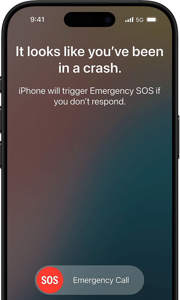 „Crash Detection“: „iPhone 14“, „iPhone 15“ ir „iPhone 16“ modeliai gali nustatyti rimtą autoavariją ir iškviesti pagalbą. Reikalingas mobilusis ryšys arba „Wi-Fi“ skambučių funkcija.
