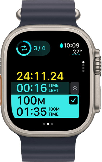„Apple Watch Ultra 2“ yra atsparus vandeniui iki 100 m gylyje pagal ISO standartą 22810:2010. Su šiuo laikrodžiu galima pramogauti nardant iki 40 m gylyje (naudojant suderinamą trečiosios šalies programą iš „App Store“) ir užsiimti didelio greičio vandens sportu. Su „Apple Watch Ultra 2“ nepatariama nardyti didesniame nei 40 m gylyje. Atsparumas vandeniui nėra neribotas ir gali mažėti laikui bėgant. Daugiau informacijos rasi: support.apple.com/en-us/HT205000.