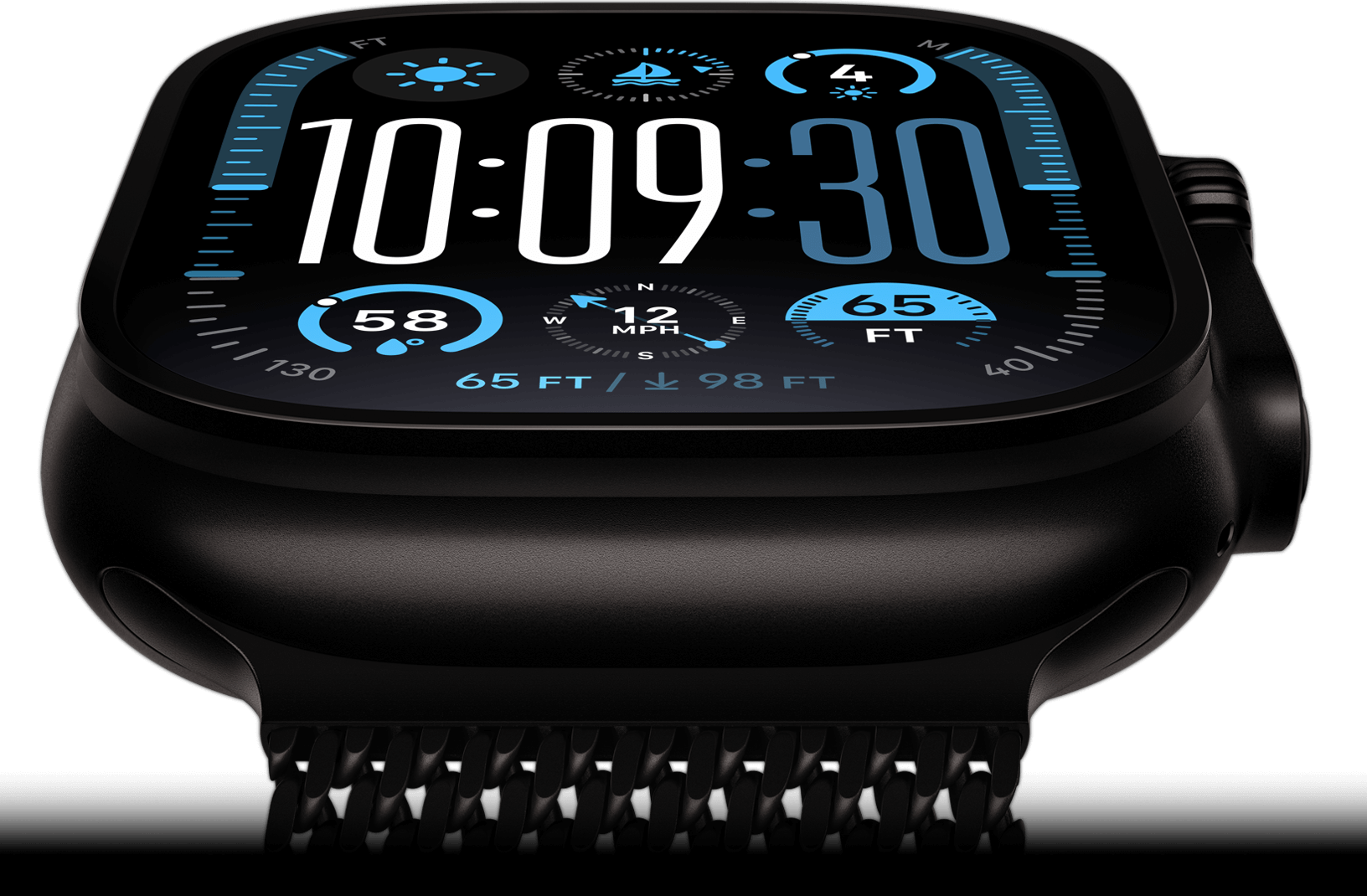 Programa „Oceanic+“: „Oceanic+“ reikalinga prenumerata. Prieinama „App Store“. Segint „Apple Watch Series 10“ galima nardyti paviršiuje iki 6 m; segint „Apple Watch Ultra 2“ galima nardyti su akvalangu pramoginiais tikslais iki 40 m gylyje. Visada laikykis nardymo protokolų, nenardyk vienumoje ir turėk antrą įrenginį.